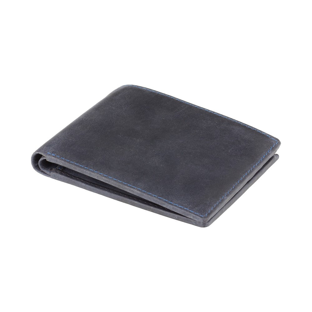 Стильный мужской кошелек синего цвета имеет винтажное оформление (эффект потертостей) и изготовлен из натуральной высококачественной кожи. Кожа обработана масляным составом с влагоотталкивающим действием для того, чтобы максимально защитить изделие. Также состав защищает кошелек от пыли.