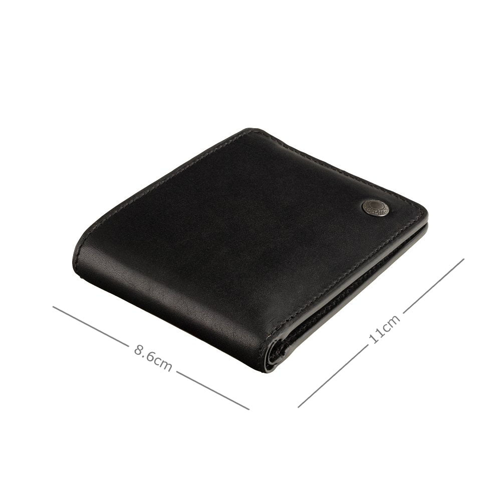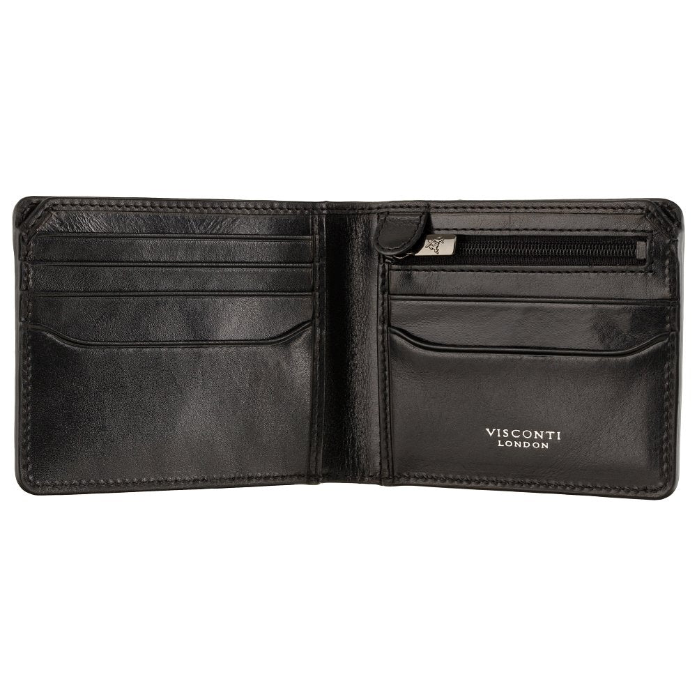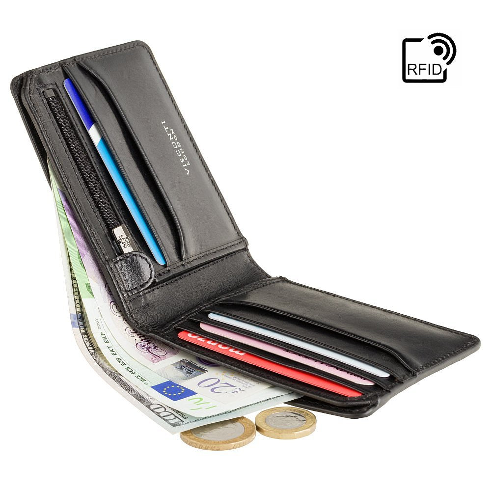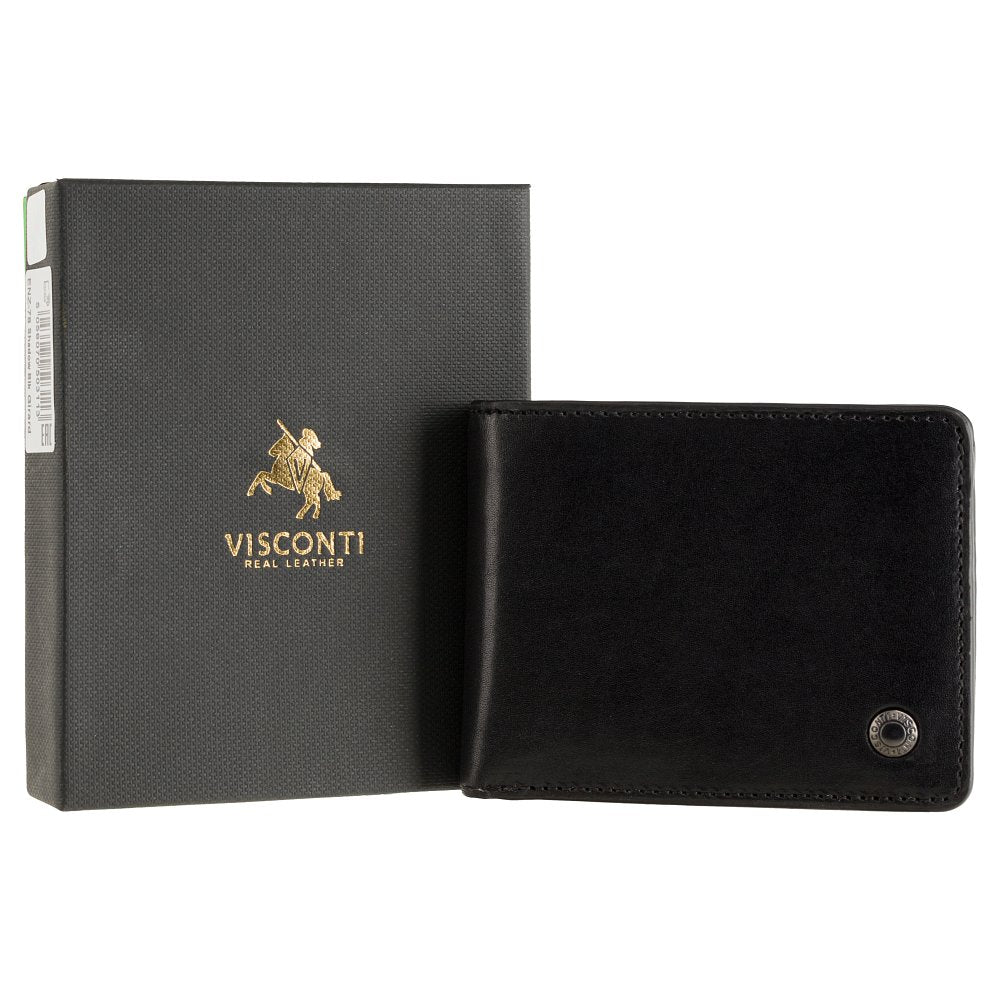 Модель ENZ78 классическая в два сложения. Внутри: 6 отделений для карточек, и одно для купюр, плоская монетница на молнии. Снаружи в углу модели находится декоративная металлическая кнопка с брендом Visconti. Кожа черная и гладкая, с небольшим отблеском.