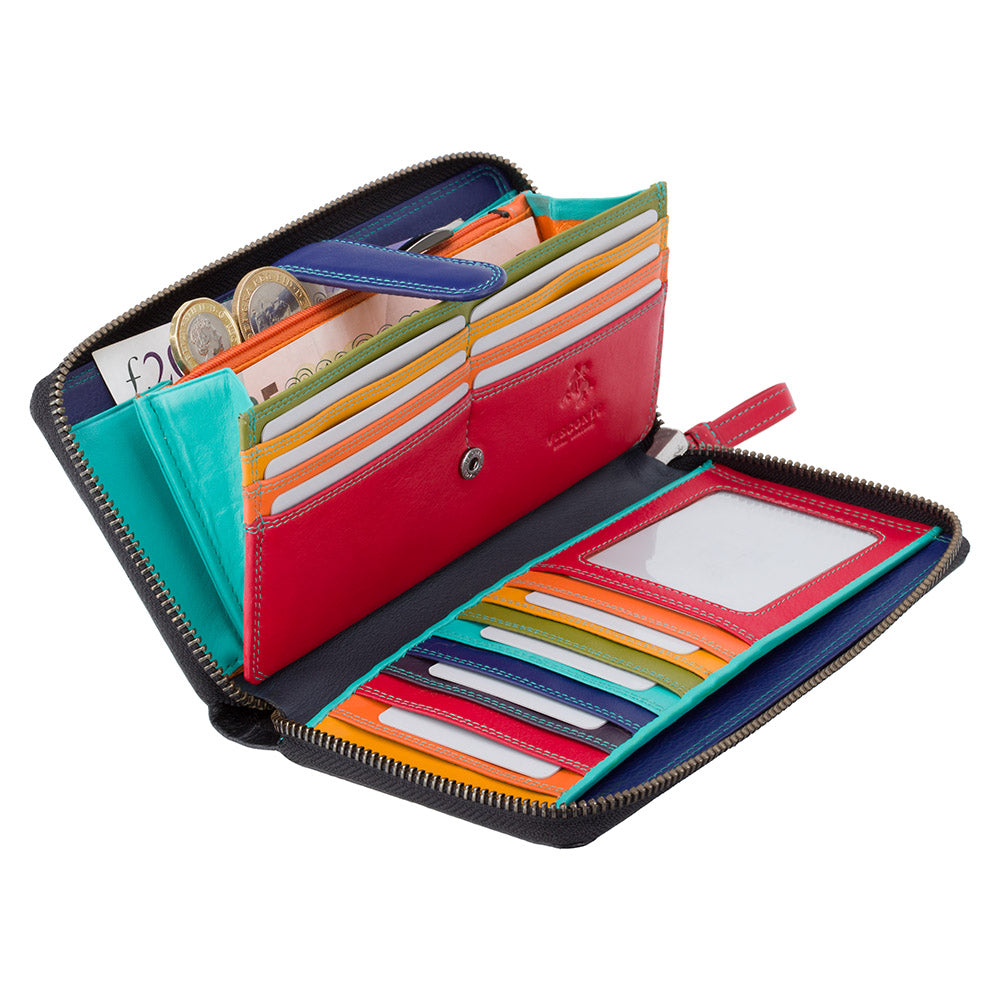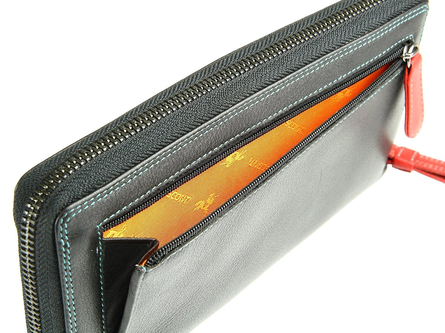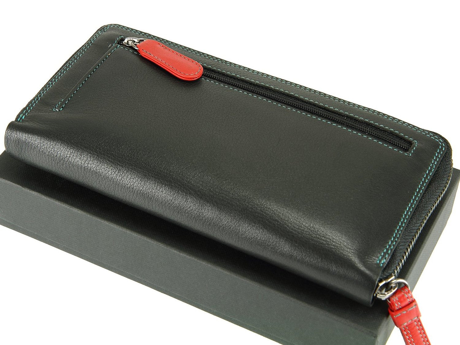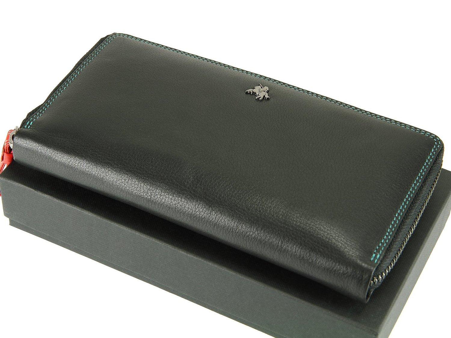Вместительный женский кошелек-клатч из телячьей кожи. Отличительная особенность серии кошельков Спектр - яркая многоцветная раскраска внутренней части и черный, классический внешний дизайн. Представленная модель многофункциональна, позволяет вместить множество карточек, мелких предметов, документов. Безопасность содержимого кошелька обеспечена наличием молний и фиксирующих клапанов. Также модель оснащена защитой от считывания бесконтактных пластиковых карт (защита RFID чипов).