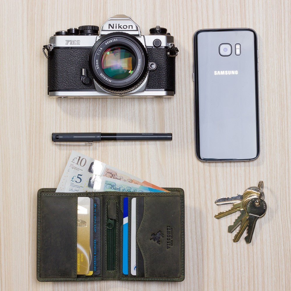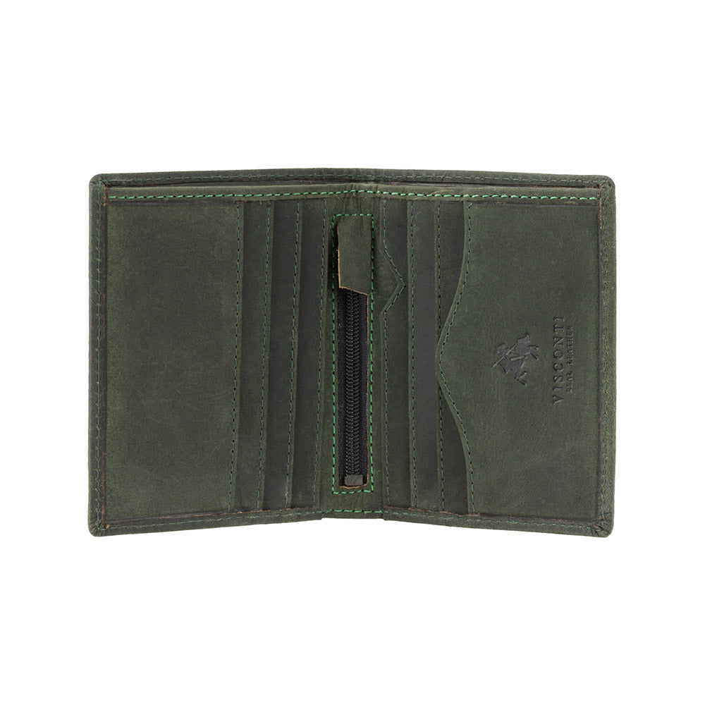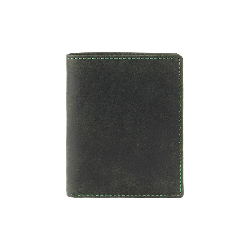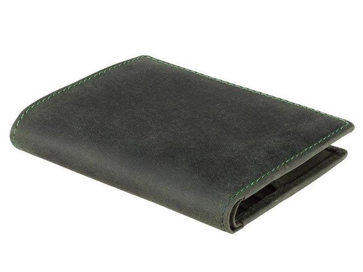 Небольшой мужской кошелек зеленого цвета. Изготавливается из натуральной телячьей кожи с винтажным эффектом (потертостей), данная кожа обработана специальным масленым составом (тип кожи: distressed oiled leather). Без монетницы и без застежки.