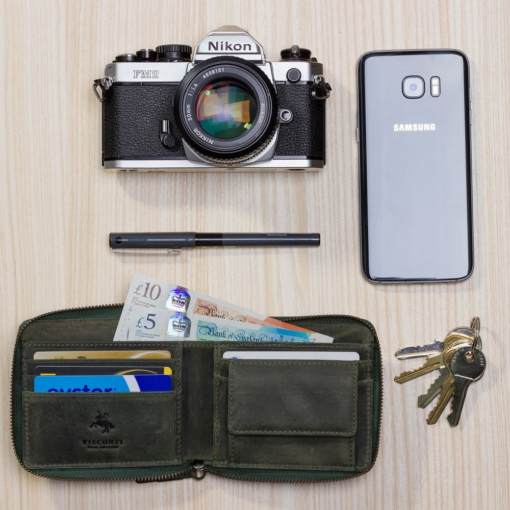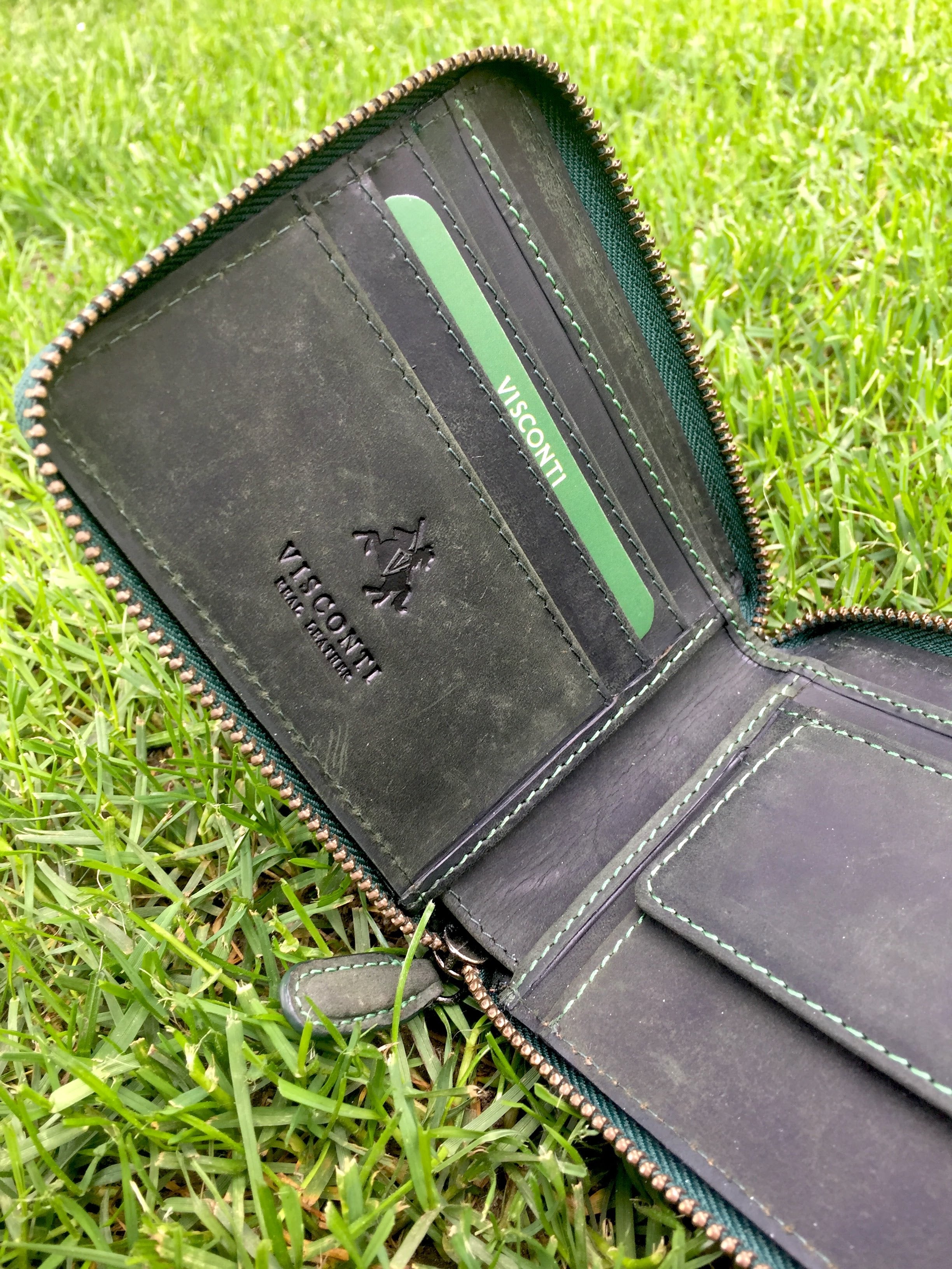 Гаманець з телячої шкіри, модель 702 з колекції Мисливець. Мабуть, єдиний похідний варіант у модельній лінійці торгової марки Visconti. Чудова модель для автомобілістів, водіїв, військових. Весь вміст вашого гаманця знаходиться під надійною охороною металевої блискавки по всьому периметру. Крім того, за рахунок спеціального просочення, гаманець має відмінний волого- і пилевідштовхуючий ефект. Колір зелений .