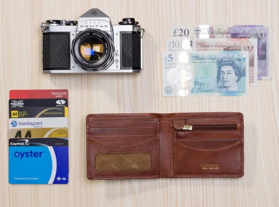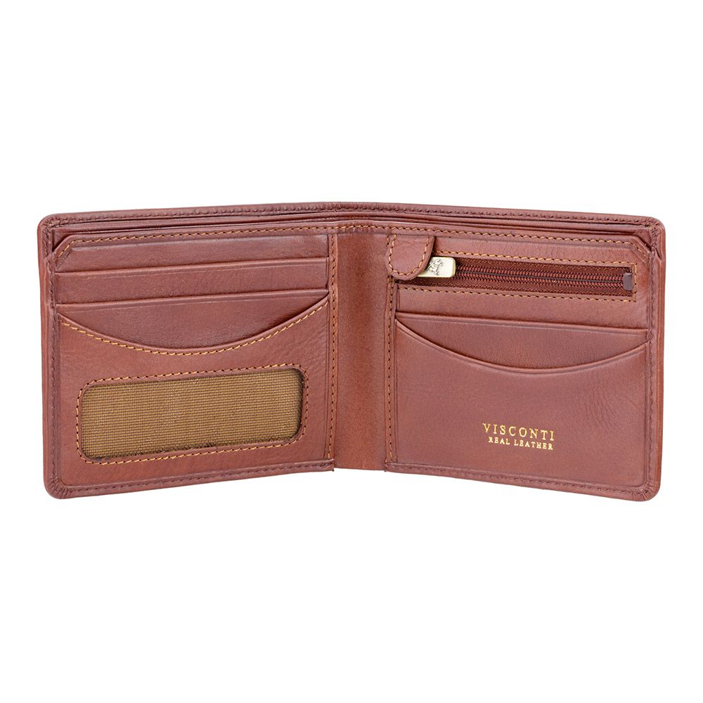 Чоловічий гаманець із м'якої та дуже міцної телячої шкіри світло-коричневого кольору. Модель має захист від зчитування пластикових карток з RFID-чіпами, що захистить ваші банківські дебетові та кредитні картки від несанкціонованого доступу. По зовнішньому та внутрішньому периметру гаманець прошитий міцною капроновою ниткою. На шкірі видавлений фірмовий логотип Visconti (тиснення золотим кольором). Гаманець горизонтальний, в два складення, з компактним відділенням для дрібниці на блискавці.