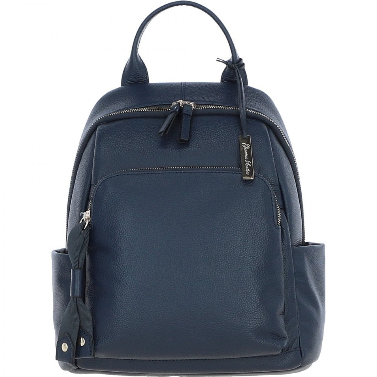 Жіночий рюкзак середнього розміру, виготовлений з м'якої синьої шкіри із зернистою фактурою.