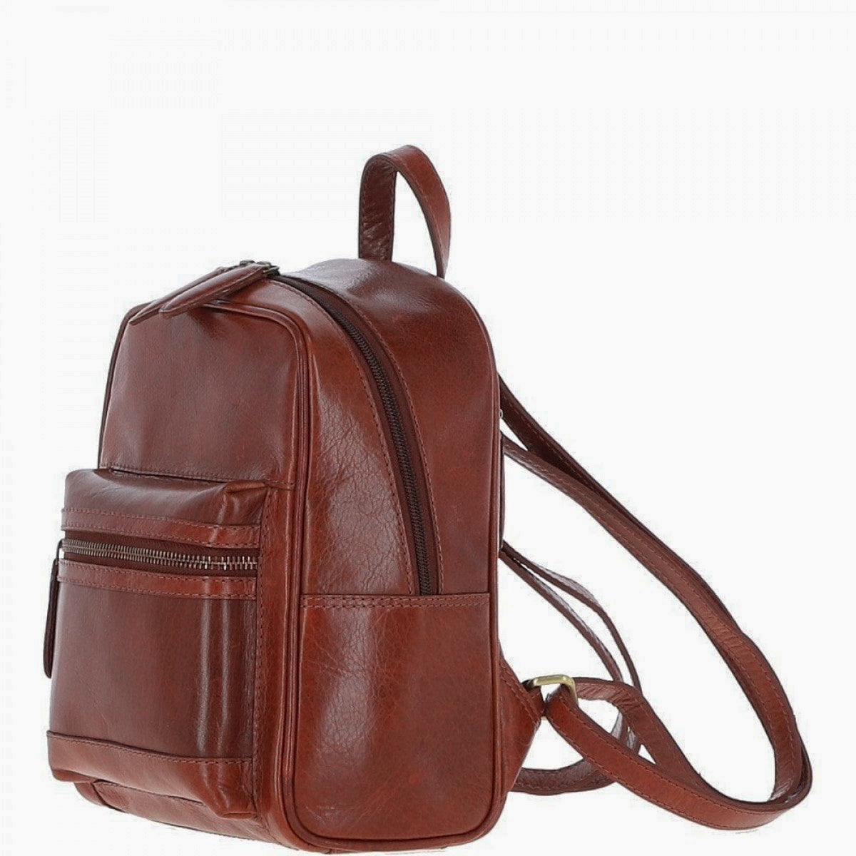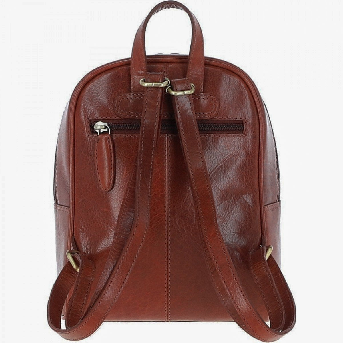 Жіночий рюкзак середнього розміру, виготовлений із міцної шкіри з матовою фактурою. Має одне внутрішнє відділення на блискавках, в одному з яких є одна невелика внутрішня кишенька, також на застібці-блискавці. З лицьового боку – маленьке відділення на блискавці. На звороті - плоска кишеня на блискавці, зручні регульовані ремені, петелька для носіння в руці.