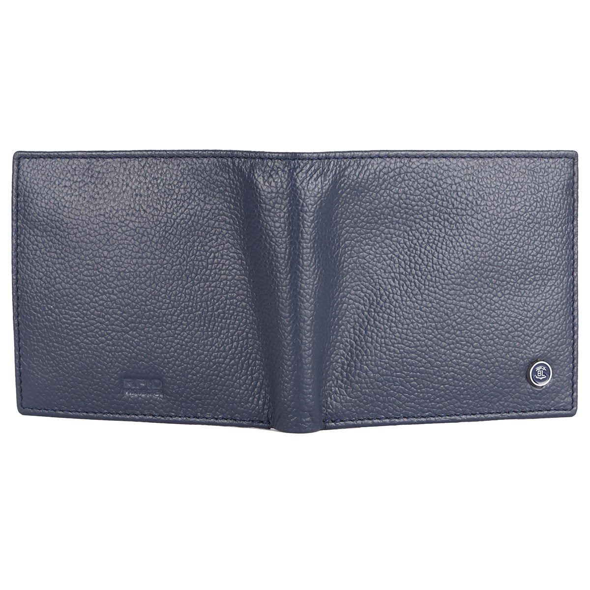Гаманець чоловічий Brampton London 31975 NAVY виконаний вручну англійськими майстрами із високоякісної фактурної телячої шкіри. Модель компактна, функціональна та зручна для повсякденного використання, має монетницю на кнопці та один відділ для купюр.